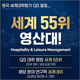 재학생 대학생활에 필요한 정보들을 제공합니다. 예비신입생 예비신입생에게 와이즈유를 소개합니다. 교직원&동문 와이즈유의 다양한 소식들을 전달합니다. WHO?자랑스런 와이즈유 OPEN CAMPUS오픈캠퍼스 YES21교직원 그룹웨어 WISEU TIMES와이즈유 타임즈 재학생 Mypage 학사정보시스템 YCMP(취업·비교과) 학사일정 등록금납부 수업 학적 학사서식 증명서발급 졸업인증제 e-class 교수학습개발원 도서관 스쿨버스 학생생활관 (기숙사) 교내식당 주간메뉴 국제교류 학생활동 풋살경기장 잔디운동장 창의설계실 생활정보 캠퍼스맵 양성평등상담실 장학 학습지원 메타버스 예비신입생 입학안내 대학소개 학과소개 언론홍보 내인생의스승 자랑스런 와이즈유인 오시는길 학생생활관 (기숙사) e-class 지원자조회 수강신청 교과목보기 메타버스 교직원&동문 YES21 교직원정보시스템 공지사항 학사일정 e-class 도서관 교수학습개발원 대학이미지(UI) 전화번호검색 캠퍼스맵(강의실검색) 증명서발급 메타버스 닫기 1 / 정지 재생 지금 와이즈유? 보도자료 캠퍼스에서 만나는 실크로드… 우즈벡 문화체험 행사 2026-04-03 보도자료 K-Food조리전공, 백련사 사찰음식 경연대회 대상 2026-04-02 보도자료 시니어모델학과, 진해군항제 350만 상춘객 매료 2026-04-02 보도자료 사회공헌센터, 양산 천성산서 ‘세대 통합형’ ESG 플로깅 전개 2026-04-01 보도자료 미용예술대학원, K-뷰티 글로벌 교육 표준 제시 2026-04-01 보도자료 웹툰학과 ‘26명 작가, 26가지 인생을 그리다’ 2026-03-31 보도자료 조리예술학부, WACS 공인 ‘지역 심사위원’ 배출 2026-03-31 보도자료 관광문화예술대학, QS대학랭킹 ‘세계 55위’ 2026-03-26 이달의 와이즈유 04.06 1학기 중간 강의평가 기간 04.06 수업일수 1/3선(자퇴자 등록금 5/6 환불 마감일) -일반휴학자 등록금 대치 마감일 04.07 1학기 중간고사 시간표 공고 04.13 하계 계절학기 개설희망교과목 신청기간 04.21 1학기 중간고사 기간 05.01 수업일수 60일(자퇴자 및 일반휴학자 등록금 2/3 환불 마감일) 05.11 1학기 전공배정 및 다전공·전과 신청기간 05.11 수업일수 2/3선-군입대휴학자 등록금 대치 마감일 정지 재생 학사일정 더보기 와이즈유 공지사항 와이즈유 새소식 전체 전체 더보기 학사 학사 더보기 장학 장학 더보기 등록 등록 더보기 취업 취업 더보기 일반 일반 더보기 사회봉사 사회봉사 더보기 바로가기 학사정보시스템 교내식당 스쿨버스 YCMP e-class 증명서발급 수업 학사Q/A 도서관 다양한 소식을 SNS을 통해 알립니다. 영산대학교 페이스북 바로가기 영산대학교 유튜브 바로가기 영산대학교 카카오채널 바로가기 영산대학교 블로그 바로가기 영산대학교 인스타그램 바로가기 영산대 “영심비 와이즈유 페스티벌” 와이즈유 영산대학교 K-MOVE 2개 운영 사업 선정 와이즈유 영산대학교 조리예술학과 김수현 학생, 산업인력공단 이사장상 수상 와이즈유 영산대학교 조리예술학과 김수현 학생, 산업인력공단 이사장상 수상 정지 재생 MICE특성화 해운대캠퍼스Haeundae Campus 관광문화예술대학 호텔관광학과 항공관광학과 관광컨벤션학과 레저스포츠관광학과 조리예술학부 K-Food조리전공 동양조리전공 서양조리전공 Bakery&Beverage전공 글로벌조리전공 미용예술학과 디자인학부 패션디자인전공 인테리어·도예디자인전공 연기공연미디어학부 연기공연예술전공 방송사진미디어전공 K-Pop전공 웹툰학과 게임VR학과 만화애니메이션학과 AI그래픽학과 시니어모델학과 웰니스보건대학 물류경영학과 글로벌학부 한ㆍ베트남통역전공 K-비즈니스전공 비즈니스법전공 미래융합대학 부동산학과 사회복지학과 헬스케어학과 아동·가족상담학과 미용건강관리학과 웰빙조리창업학과 실버재활학과 웰니스특성화 양산캠퍼스Yangsan Campus 웰니스보건대학 간호학과 물리치료학과 치위생학과 태권도학과 동양무예학과 경찰행정학과 융합전공학부 동양상담복지학과 한국어문화교육학과 기계ㆍ자동차공학과 수소시스템공학과 전기전자공학과 건축공학과 컴퓨터공학과 드론공간정보공학과 미래융합대학 인문문화융합학과 노인복지상담학과 성심교양대학 자기설계전공학부